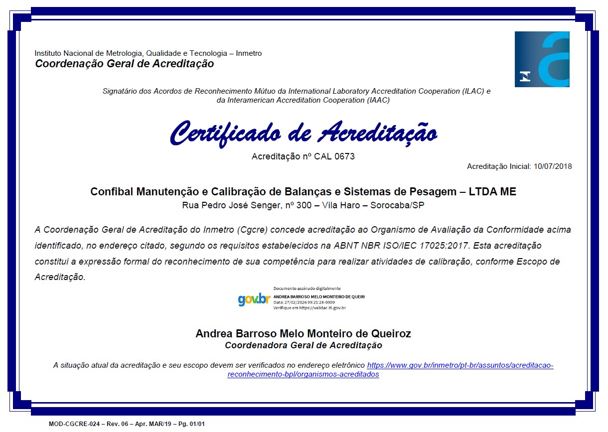 A ConfiBal é Laboratório acreditado pela Cgcre de acordo com a ABNT NBR ISO/IEC 17025, sob o número CAL 0673, para calibração de balanças até 3500kg