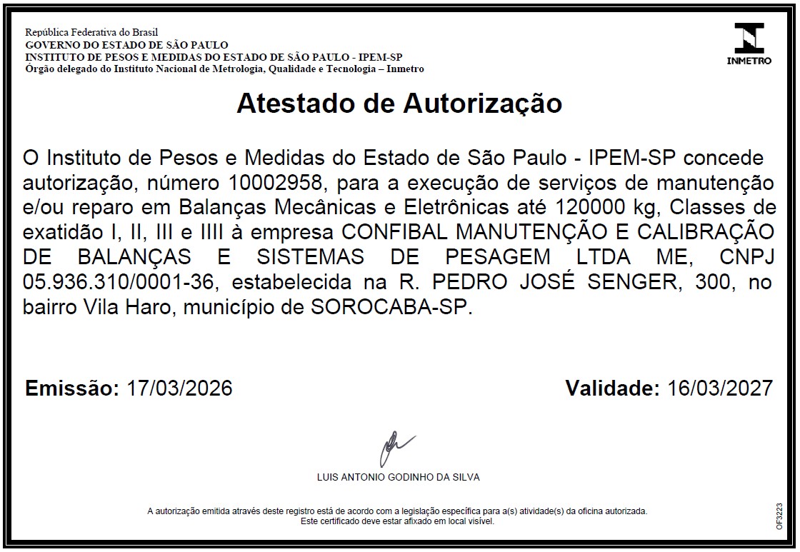 A ConfiBal Balanças possui autorização do IPEM para manutenções de Balanças até 120.000,0 Kg.